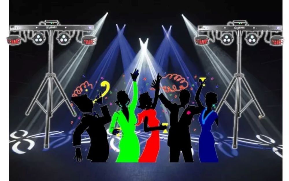 2 barres identiques de 6 jeux de lumières autonomes sur pied composées en tout de quatres projecteurs d'ambiances, quatres effets à led, deux lasers multipoints rouge et vert, huit leds blanches et UV le tout prémonté sur deux barres et synchronisé au rythme de la musique