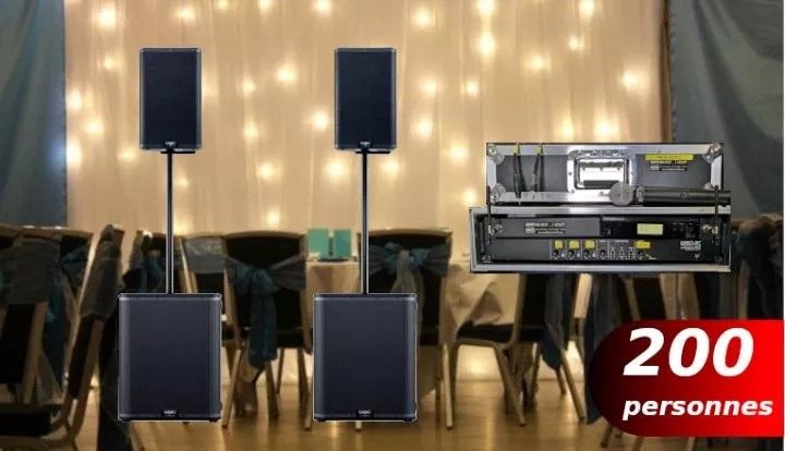 Une formule pour sonoriser tous vos événements avec la possibilité de raccorder deux ordinateurs ou téléphones via des prises casques, un micro sans fil pour toutes vos animations et enfin deux enceintes et deux caissons de basse amplifiés vous permettant d'accueillir jusqu'à 200 personnes sur votre piste de danse.